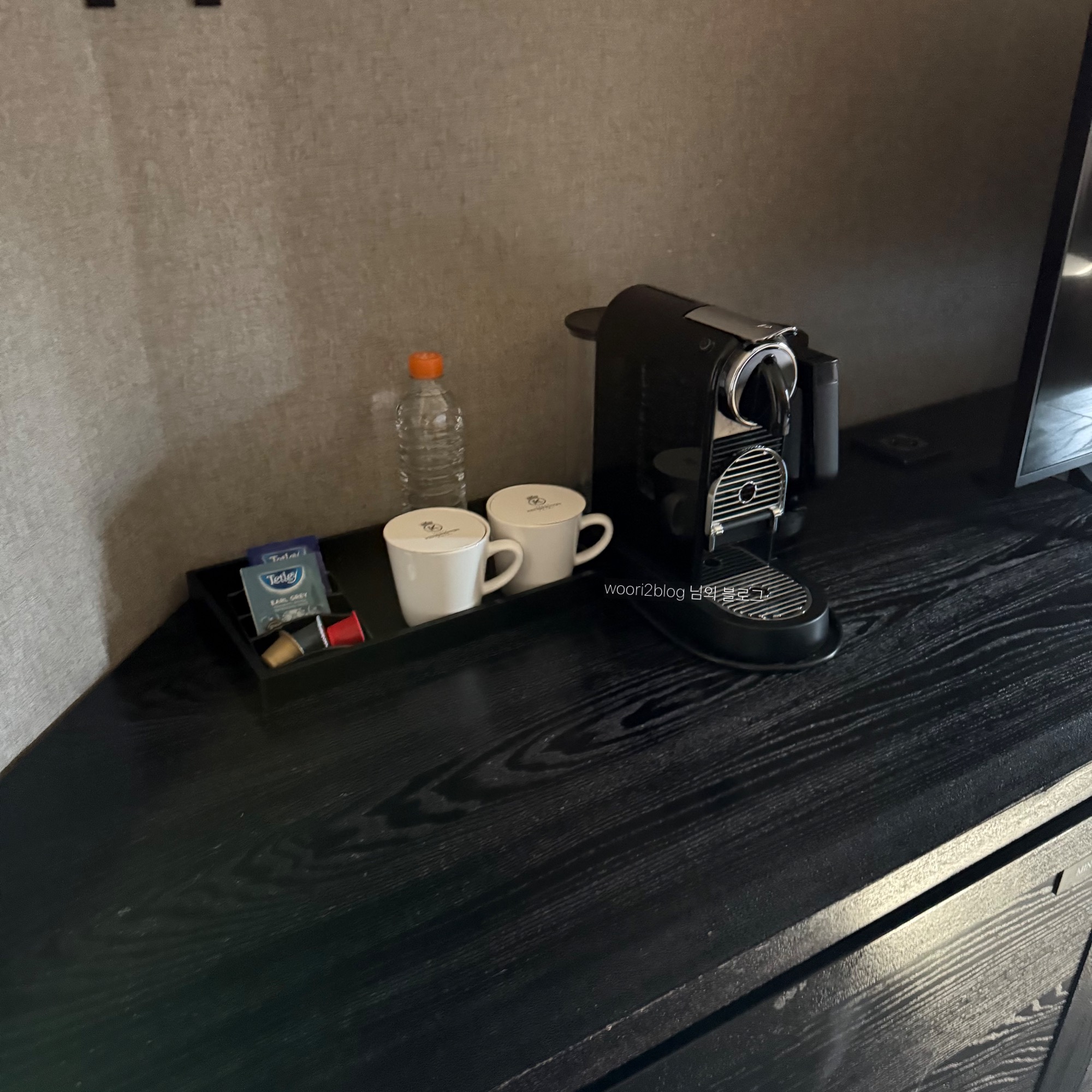 티, 캡슐, 컵, 네스프레소 커피머신과 커피포트들이 준비되어있어요.