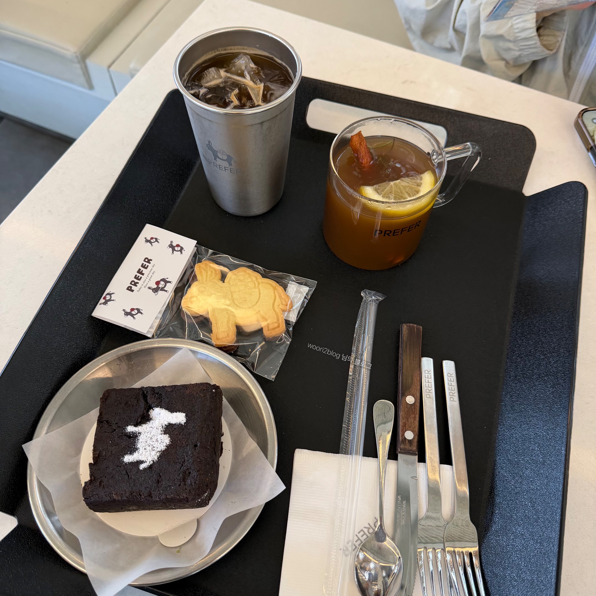 생강차 1잔, 동키 쿠키 1봉, 브라우니 1개